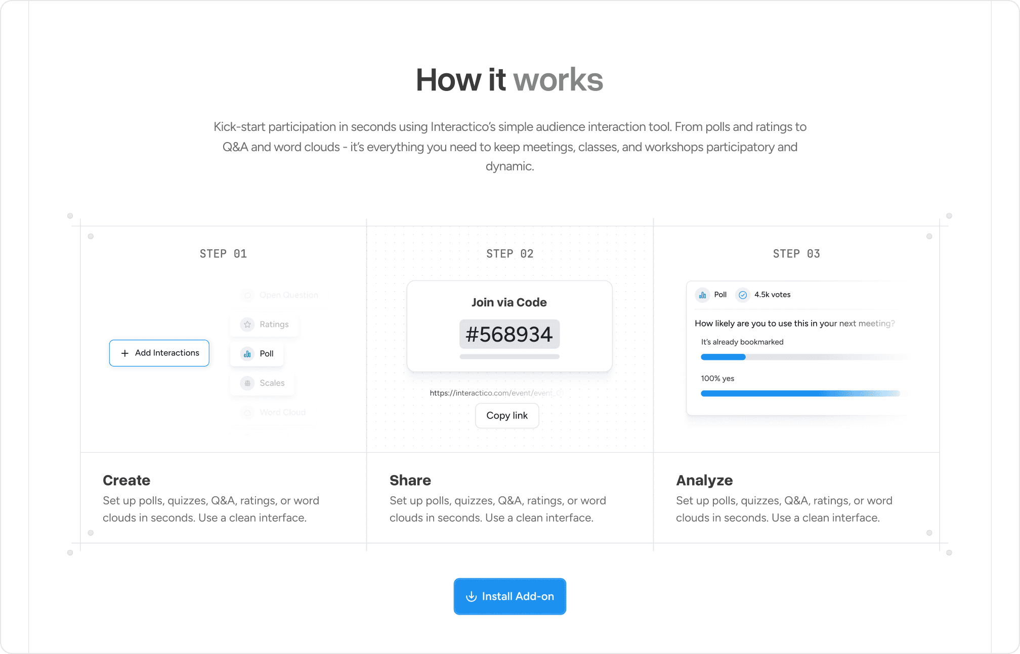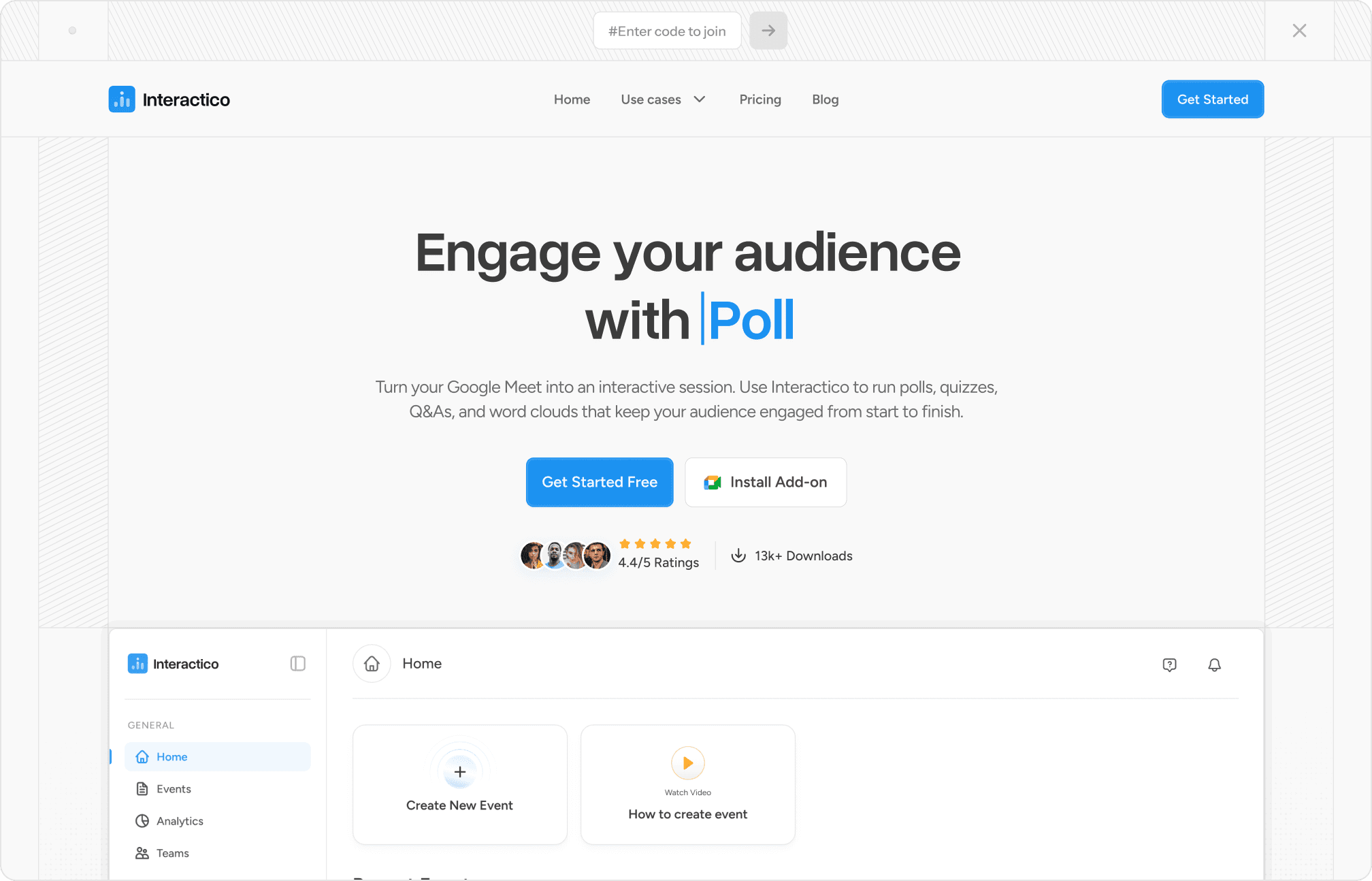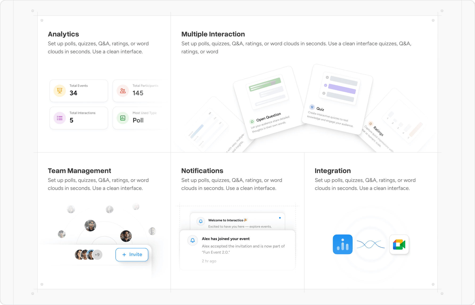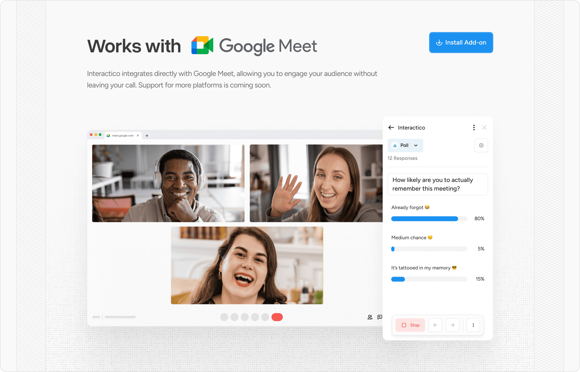 For Interactico, we crafted the brand identity, website, and end-to-end product design, from the Google Meet plugin to the full web app.